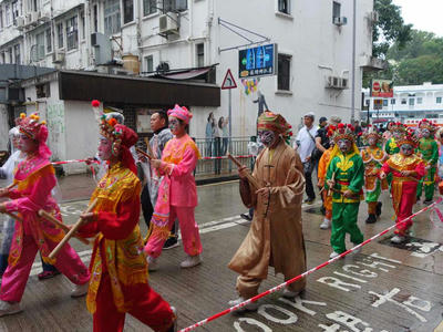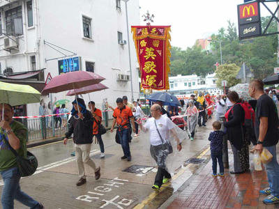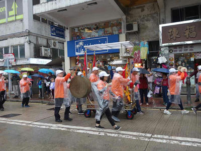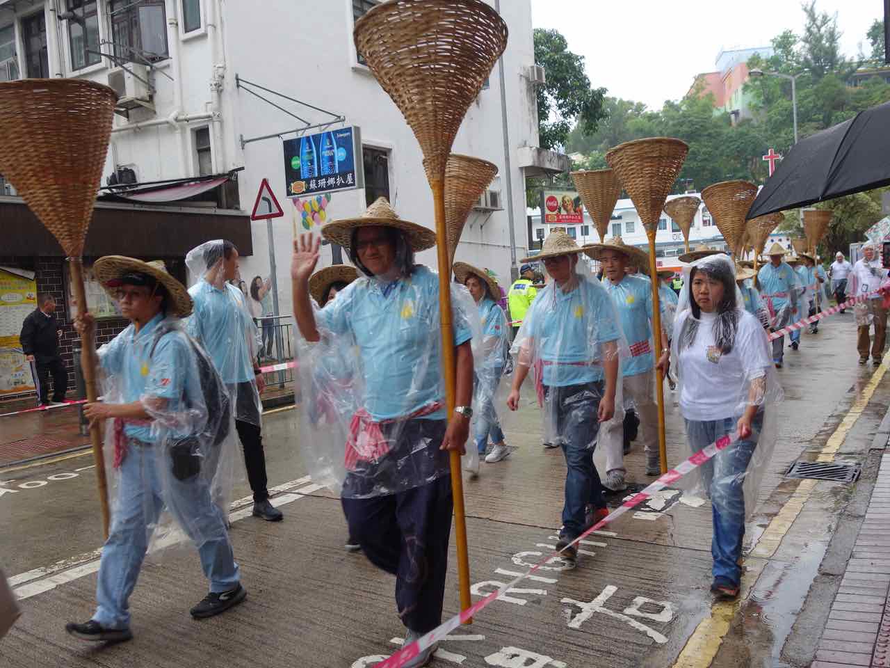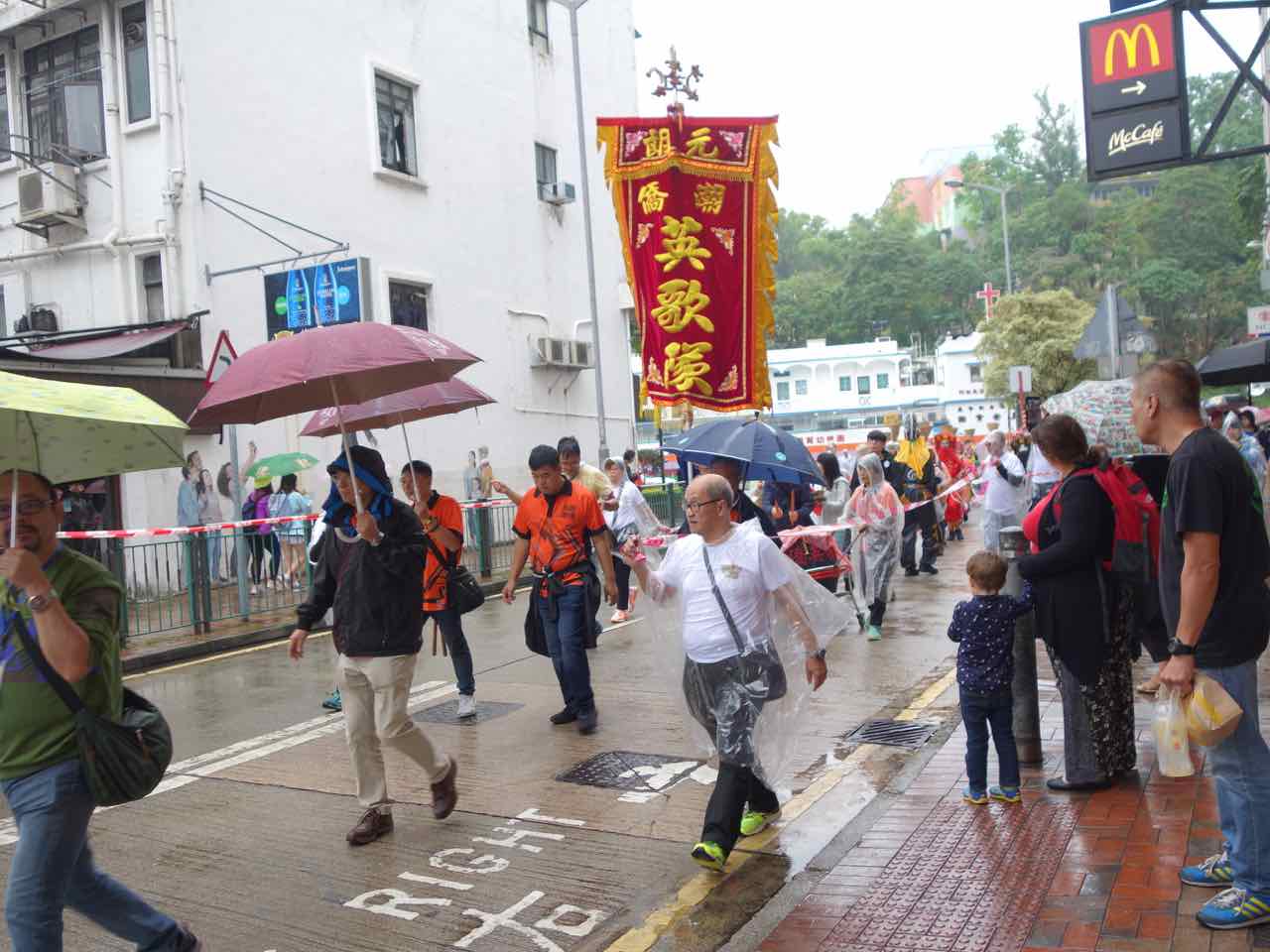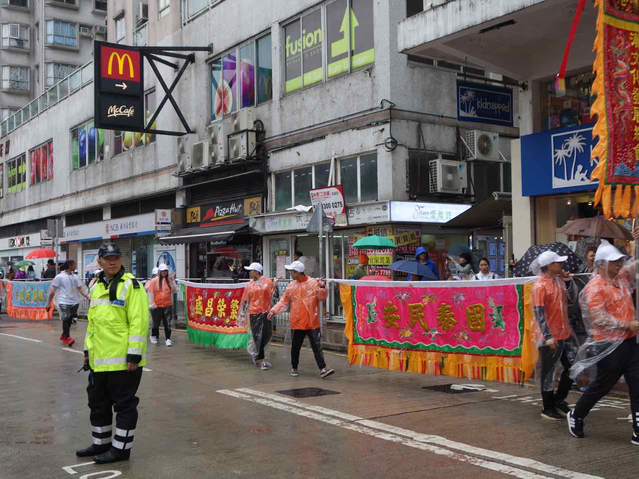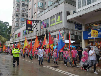 昨日の山帰り、西貢に着いたら警察に誘導されてパレードをやっていた。かなりの人数で、楽器を奏でたり、仮装したり、旗や何だかわからないものを持った人もいて、雨の中ご苦労様です!